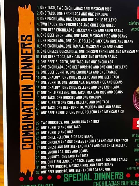 Specialty dinners offer exciting options like Cazuelón and Taco Loco, each showcasing bold flavors. For those craving comfort food, choices like Arroz con Pollo and Fajitas fulfill every craving.